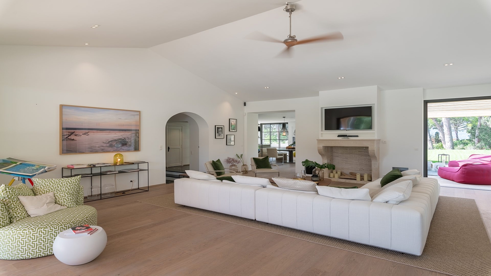Séjour avec cheminée ouvrant sur une terrasse couverte